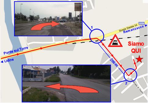Proveniendo da Udine, prendere la SS53 (via Cividale) in direzione di Cividale. Al primo incrocio dopo il ponte sul torrente Torre girare a destra (1) in via Strada Oselin. Attraversato il passaggio a livello, percorrere 200 m, svoltare a sinistra (2) e imboccare la prima a sinistra. |